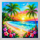 Vibrant tropisk strand med en bedövande solnedgång, turkos vågar och blommor i levande färg. Perfekt för att framkalla avslappning, sommarsemester och god naturskönhet.