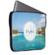 Ett laptop sleeve med ett vackert foto med en tropisk strandort. Söt blå stranden vatten och vit sandstrand med överskötta hinnor ge det en stillastående övibe. En vit cirkel som läggs ovanpå med ditt namn och som initialt innehåller ett monogram.