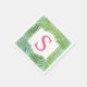 Den tropiska stil-cocktail-napkin-konstruktionen har en grönt handflatan löv mönster på bågfronter med skalbaggar med grönt blå bakgrund färg. Vit dekorativ ram har ett monogram brev i smart rosa (kan anpassas) som du kan anpassa med ditt efternamn som första början.