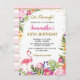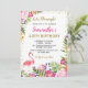 Härlig tropisk födelsedaginbjudan som presenterar vattenfärgillustrationen av en rosa flamingo, vibrerande blommor och en guld- bokstäver för faux. Denna anpassadeinbjudan är perfekt för sommar/tropiska/för hawaiibo/för luau themed firanden!