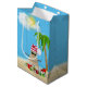 Cute sandman med en bockkapsyl, solglasögon och julklappar under ett tropiskt handflatan träd med färgstarkt ljus.