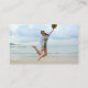 Tropiskt sunset-affärskort i social med ett eget foto på baksidan och detaljer i vitt. Lägg till ditt mobila nummer, din facebook-sida, social-medieferens, e-post och webbplats tillsammans med ditt namn i ett fet reflektionsskript och logotyp- eller profilfoto mot en färgfull bakgrund av en tropisk solnedgång med fåglar som flyger över himmel och handflatan träd i förgrunden. Handflatan träd tog affärskortet med en solnedgång över havet i varmt färg med mörk handflatan träd i förgrunden.