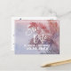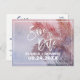 Den här tropiska solnedgången sparar datumet på vykortet är perfekt för ett mål- eller strandbröllop. Utformningen har en fantastisk solnedgång för rosa, lila och blå vattenfärg, komplett med handflatan träd som blåser i bron.
