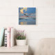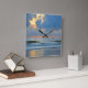 Utformningen har en scenisk strandbild av abstrakten med en ljus orange himlar som bakgrund. Ett grumligt himlar återspeglas på vatten som en flock fåglar som långsamt flyter över lugnens surfa vid solnedgång. Du kan nästan känna en mjuk bröst och lukta salt luft!