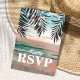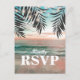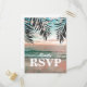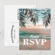 Svarskort för stranddestinationbröllop med en tropisk palmerstrandmiljö, sträng med gnistrande ljus och en RSVP-postkortmall.