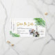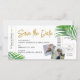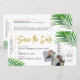 Tropiskt Strandbröllop Spara Datum Ombordstigningskort med Modernt Whimsiskalt Palmbladsmönster och Trendig Script Font har massor av anpassningsbara mallfält, foton, reseinformation och en personlig QR-kodgenerator på baksidan av kortet.
