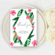 Tropical Handflatan Watercolor Inbjudningskort för möhippan. Konstruktionen har en vattenfärgad elegant buquet av klassisk strandvattenfärg, grönenergi och blommor, inklusive rosa hibiscus, orange och blåa fåglar av paradiset, grönt grey och mörk grönt handflatan löv.