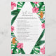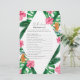 Tropical Handflatan Watercolor Inbjudningskort för möhippan. Konstruktionen har en vattenfärgad elegant buquet av klassisk strandvattenfärg, grönenergi och blommor, inklusive rosa hibiscus, orange och blåa fåglar av paradiset, grönt grey och mörk grönt handflatan löv.
