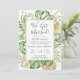 Denna eleganta tropiska vigselreceptionsinbjudan har gröna och gyllene palm-, philodendron- och ormbunksblad. En elegant gyllene ram framhäver den mörkgröna texten. Gyllene fläckar framhäver denna exotiska botaniska design och ger en touch av modernt infall till inbjudan. "Vi gifte oss!" tillsammans med brudens och brudgummens namn visas högst upp. Detaljer om vigseln och information om mottagningens plats och datum finns under. RSVP-information finns på baksidan av inbjudan.