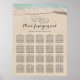 Planen på bröllopsresa för Beach bord med en sommartropisk strandbakgrund, en sandstrand i vintagen med två hjärtan i strandlinjen, initialer och en modern modell för sätesschemat för bröllop på 20 bord.