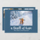 "Det är hoppets trillande, den rika världen gläds." Vackert blått julkort med foton.