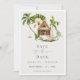 Denna inbjudan från bröllop spara datum är en tropiskt djungelmönster med naturens färg. Den har handflatan träd, lustiga regnskogar och bungalows inneslutna i ett vackert tropiskt paradis.