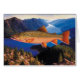 En vacker oljemålning av en regnbåge framför ett lush-berg och sjö-bakgrund.