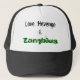 Lastbilsförarestilhatt med "kärlek, hämnd & Zombies" över bekläda.