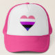 Svart Truckerkeps med en hjärtkonstruktion i färg av flagga pride av könsmognad; en rosa-, vit-, magenta-, svart- och lila-design