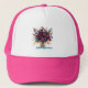 Bilden visar en blombukett med en mörk, sofistikerad palett färg. Den centrala sammansättningen består av stort ro i burguner och magenta, med ljusare detaljer som ökar djupet. Mellan ro finns mindre blommor i blått och lila, vilket skapar en stark kontrast.
