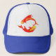 Ablue och vit truckerkeps för en piscean med två briljanta orangar i djup blå bakgrund, från en vattenfärgsmålning av Judy Adamson.