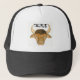 En svart och vit truckerkeps med en tjur, från en vattenfärgsmålning av Judy Adamson och ord, TAURUS ovanför den.