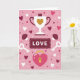 This card shows a soft pink background filled with small hearts in white, pink, and dark red, plus a few tiny white stars and little dark red mushrooms with heart spots. Near the top, there’s a white trophy with a dark red detail and a gold heart emblem, like love is the prize. Under it sits a dark red banner that looks like a ticket edge, with the word “LOVE” printed in simple white letters across the center. On both sides of the banner are two white keys, each with a heart shape at the top, angled downward as if they’re meant to be used. At the bottom, a bright pink heart-shaped padlock waits with a gold keyhole in the middle. The whole scene feels sweet and romantic, with everything pointing toward opening that little lock ❤️. It’s a cute way to say love can be earned, found, and kept close 💕.