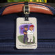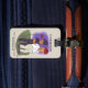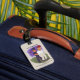 En bagagemärke med en lustig tecknad om Trump och hans gripande. Originalteckningar efter DBcartoons.