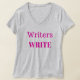 Kvinna denNacke T-tröja med författarecitationstecknet "författare skriver" i shock rosatryck. Detta citationstecken påminner mig att få min ordräkning i varje dag. Få det för dig eller författare i ditt liv.