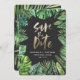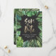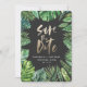 Den moderna tropiska vattenfärgsbladet handflatan i löv sparar datumkorten. Handmålad guld-effektskripttext. En del av en sommarinsamling av trender. Bakgrunden till färg kan ändras.