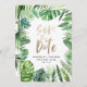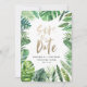Den moderna tropiska vattenfärgsbladet handflatan i löv sparar datumkorten. Handmålad guld-effektskripttext. En del av en sommarinsamling av trender. Bakgrunden till färg kan ändras.