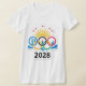 Utskrift på vita kläder. För kvinnor. Symbol för de olympiska spelen. Sommar-OS kommer att hållas 2028 i USA, i Los Angeles.