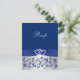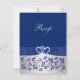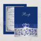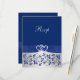 Detta eleganta och romantiska silvergråa och kungligt blå blomstermönstrade bröllops-R.S.V.P.-kort har ett tryckt band och rosett med ett par tryckta diamantjuveler och en falsk glitterhjärtspjäs på som matchar bröllopsinbjudan nedan. Texten och typen av papper är anpassningsbar. Vissa papper kommer att ändra designens färg. Jag skulle INTE använda guld-, champagne- eller silvermetallpapper eftersom de kommer att fördunkla designen och missfärga diamanternas vita utan att tillföra extra glans än vad du skulle få med det metalliska is-papperet. Filtpapper kommer också att missfärga designen. OCKSÅ, om du ändrar storlek på inbjudan, eller om du byter teckensnitt, eller storleken på teckensnittet, kan delar av designen och/eller texten kapas. Allt kommer att skrivas ut som du ser det på din skärm. Jag kommer inte att se din inbjudan, och Zazzle kommer INTE att rätta någonting (stavfel, feljustering etc.). Om du behöver hjälp med denna inbjudan, vän