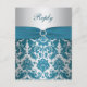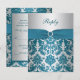 Detta eleganta silvergrå och blågröna damask-svarskort för bröllop har ett tryckt sidenutseende band och en tryckt diamatinspirerad spänne som matchar bröllopsinbjudan nedan. Texten och typen av papper är anpassningsbar. Vissa av papperstyperna kommer att förändra färgen på designen. Jag skulle INTE använda de metalliska papperstyperna i guld, champagne eller silver, eftersom de kommer att fördunkla designen och missfärga de vita diamantimitationerna utan att tillföra något extra gnistrar jämfört med det metalliska is-papperet. Filttpapper kommer också att missfärga designen. OM du ändrar storlek på inbjudan, eller om du byter typsnitt eller storlek på typsnittet, kan delar av designen och/eller texten kapas. Allt kommer att skrivas ut som du ser det på din skärm. Jag kommer inte att se din inbjudan, och Zazzle kommer INTE att rätta någonting (stavfel, felaktig justering etc.). Om du behöver hjälp med den här inbjudan, vänligen