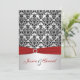 Den svarta och silver-grått-dammens bröllopsinbjudning har ett rött tryckt band och tryckt diamantjuvelsbrosk på det. Zazzle kommer inte att redigera något för typos eller felaktig justering, och jag kommer inte att se din inbjudan. Allt skrivs ut som det visas på bildskärmen, så om du behöver något ändrat, kontakta mig innan du beställer och jag är lycklig för att hjälpa till. Om du vill ha en annan storlek av inbjudan ska du INTE ändra den själv. Den här designen skapades som en 5x7, så om du ändrar den till en annan storlek ändras förhållandet mellan designen och delar av den skärs av vid utskrift. Det skulle vara perfekt för ett rött, silver och svart bröllop, ett fallbröllop eller ett vinterbröllop. Texten och den papprare texten är anpassade. Om du behöver några andra matchande objekt skickar du en e-post till niteowlstudio@gmail.com. Befintliga matchande objekt visas nedan.