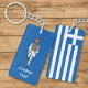 Grekisk Evzone-vakt (tsolias)-ikon som håller ett vapen, bär röd fez, fustanella och tsarouchia. Anpassningsbarnas bakgrund färg. Anpassningsbar. Greklands flagga på baksidan.