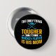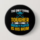 Hockey Temaknapp för hockey mamma med hockey pucks och sticks med text av vitt, gult och blått som lyder The Only Sak Tougher Than Hockey Player is Hans Mamma!