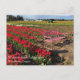 Cute rosa-bänk framför rader av vackra tulpaner och en traktor i fält. På träsket Tulip-gården i Woodburn, Oregon. Foto taget i april 2017.