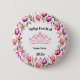 Customize-able button pin has a pretty tulip print and a royalty crown.