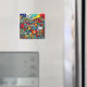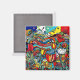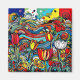 A.I. Assisterad utskrift av en surrealistisk arrangemang av blommor i olika färg som pockar mot en snurrande psykodelisk, mönstrad bakgrund.