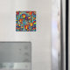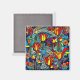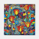 A.I. Assisterad utskrift av en surrealistisk arrangemang av blommor i olika färg som pockar mot en snurrande psykodelisk, mönstrad bakgrund.