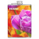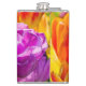 Färgglada violetta, lila, rosa tulpaner på en rabatt. Praktiskt taget alla regnbågens färger närvarande. Ljust och positivt blomsterarrangemang. Flaskbehållare för det. Anpassningsbart. Du kan ändra eller ta bort mallnamnet Henry.