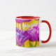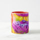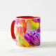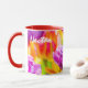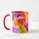 Färgviolett, lila, rosa-tulpaner på en flowerbed. Så gott som hela regnbågen färg finns. En ljus och positiv blommigt-scen. Kaffe mugg. Anpassade. Du kan ändra bilden och du kan ändra malltexten Nectar. Ha roligt!