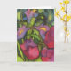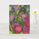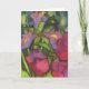Ett hälsning-kort med ljusa tulpaner med rosa och lila och blå stryk mot en mörkens läcker bakgrund.