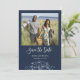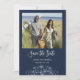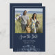 Detta marinblått, ömtåligt jokertecken för blommigten bröllop spara datum är elegant och enkelt. Ditt favoritfoto kommer till kortets framsida. QR-koden på baksidan gör det enkelt för gästerna att få information om din speciella dag