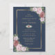 Inbjudan era gäster till din elegant sjöng blå och bröllopsfest med de här blommigtens bröllopsinbjudningarna med rosa ros som lägger till en guld ram på en marin blå bakgrund.