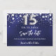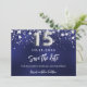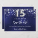 En modern och elegant Spara datum för en Quinceañera, 15:e födelsedagsdelsdag. En marin blå bakgrund med faux silver-stjärnor. Anpassa och lägg till ett datum och namn. Den blå färg är ojämn. Texten: Spara datumet skrivs med ett stort trendig-handskript i stil.
