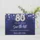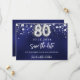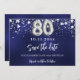 En modern och elegant Spara datum för en 80-årsdel. En marin blå bakgrund med faux silver-stjärnor. Anpassa och lägg till ett datum och namn. Den blå färg är ojämn. Texten: Spara datumet skrivs med ett stort trendig-handskript i stil.
