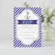 Svars-/svarskort för marint blått, vitt rand och ankarplats för nautiskt bröllop OSA. En snyggt strimlade mönster-design med marint blått, vitt diagonalt rand, ett ankare med blått hjärta och rep och texten i ram med en banderoll. Modern men med en vintage ser ut på sätt och vis. Du kan ändra bakgrund och text som färg väljer från över 200 färger i diagrammet Zazzle färg. Den här klassdesignen är en fullständig mall för anpassade och ingår i en perfekt för bröllop under en sommar-bröllop.