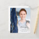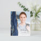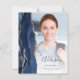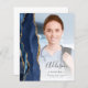 Trendigets tillkännagivande från 2025 i studenten innehåller en marin blåfärgad havsfärgad daggad gräns med markeringar från Faux guld glitter. Student först namn visas som ett handskriftsskript för elegant charcol grått på ett lodrät-foto, tillsammans med efternamnet, skolåret och klassåret i typsnittet. Ett vitt övertoningsfilter hjälper till att visa texten. Ett andra foto visas på baksidan, tillsammans med meddelandet och detaljerna i grått-texten från kol på vit bakgrund.