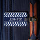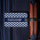 Mörk marin blå och vit geometrisk zigzag chevron mönster. Liten text på ena sidan och sen på motsatt sida