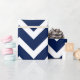 Mörk marin blå och vit geometrisk zigzag chevron mönster. Liten text på ena sidan och sen på motsatt sida
