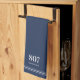 En enkel kökshandduk av elegant och anpassningsbar med hemma- och gatunummer namn i vitt brev med rand och detaljuppgifter. Gör en underbar återförsäljare som sluter gåva, en gåva till husuppvärmning eller en unik avslutande beröring för ditt semesterhem.