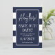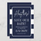 Få bröllop organisationer att börja med dessa platta spara datum meddelande-kort i mörkens blå och vita - klassiskt nautiska/kustnära färg. Utformningen är djärv och roligt, och meddelandekorten kan vara personlig med att inkludera namn och det viktiga datumet. Dessa anmälningskort skulle vara idealiska för en strand/kust/nautiska bröllop.